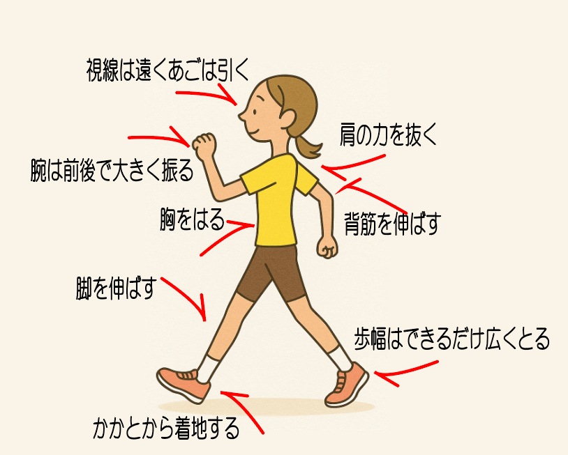 大股だと自然と背筋や膝が伸び、腕も振れます。